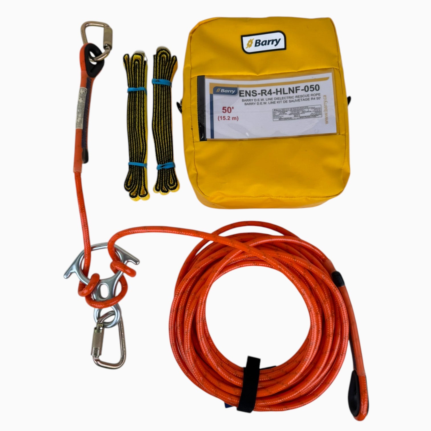 The Rescue Kit for bucket trucks and tower self-evacuation includes the Barry D.E.W. Lines dielectric rescue rope, renowned for its exceptional performance and reliability. The rope is securely stored in a hermetically sealed bag, ensuring easy inspection and preserving its dielectric properties. Designed for quick installation, deployment, and use in critical situations, this kit is ideal for the self-rescue of operators working in energized zones. The standard rope provided offers superior insulating properties, consistent with the Barry D.E.W. Lines range. Additionally, we offer rope options with specialized features, such as inherent fire resistance, to cater to specific operational requirements.